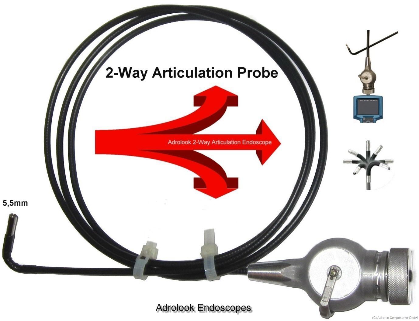 Articulation Probe mounted on the Videoscope 150° Articulation manual tip articulation. Neck with 360°manual rotatable neck Camera : CMOS 300.000 pixel, 60fps@AVGADOF: 1,5-10cm