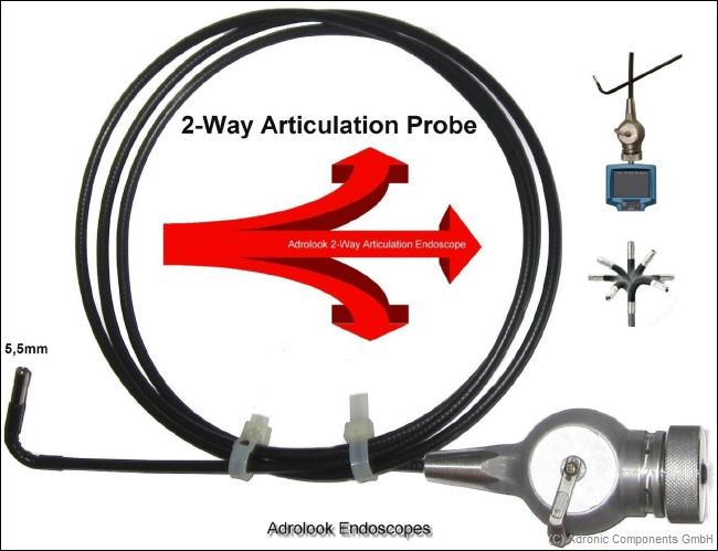 Articulation Probe mounted on the Videoscope 150° Articulation manual tip articulation. Neck with 360°manual rotatable neck Camera : CMOS 300.000 pixel, 60fps@AVGADOF: 1,5-10cm |